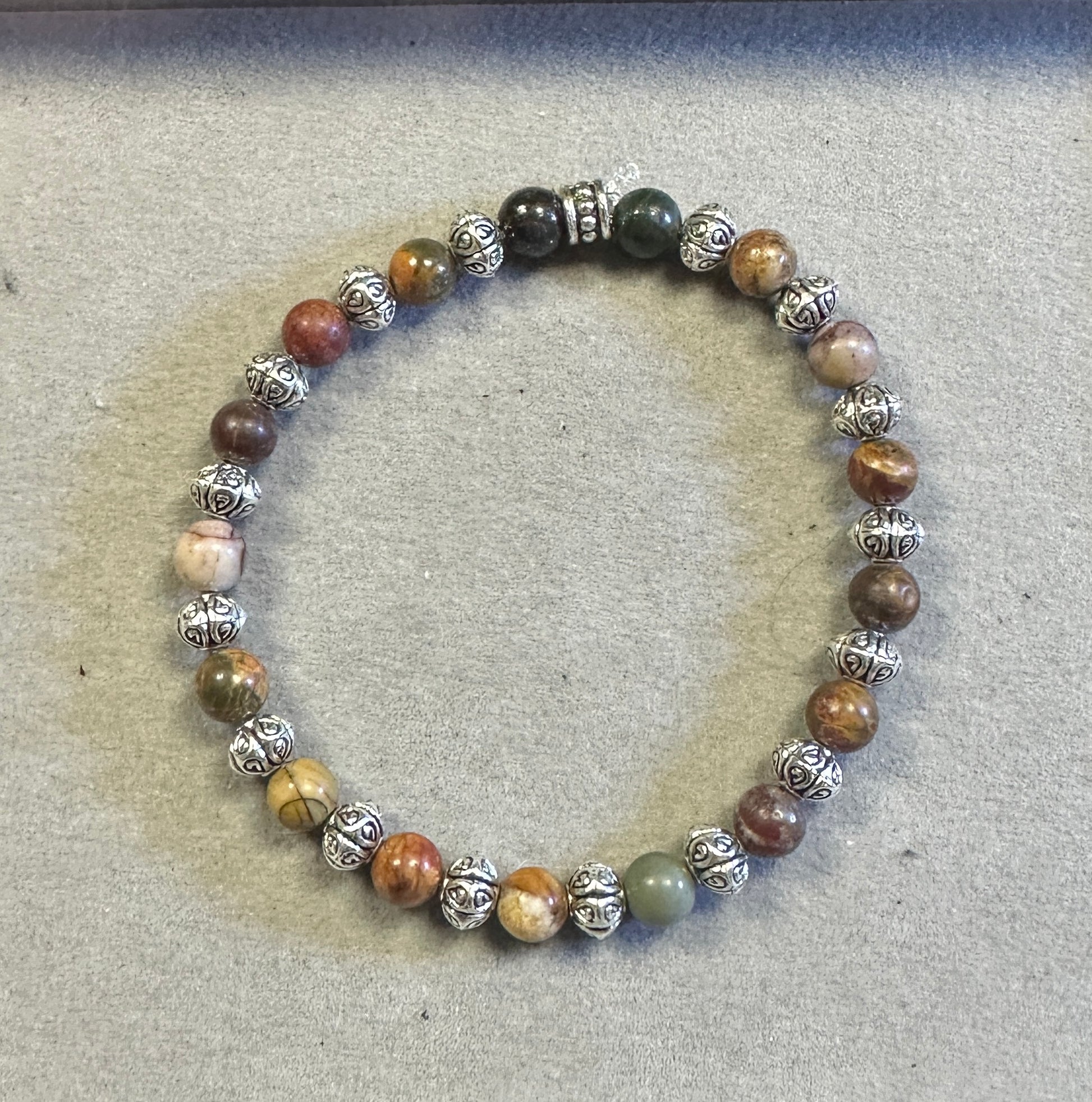 Earthy Sea Sediment Stone 6mm with Tibetan Silver Bead – Handmade Gemstone Stretch Bracelet