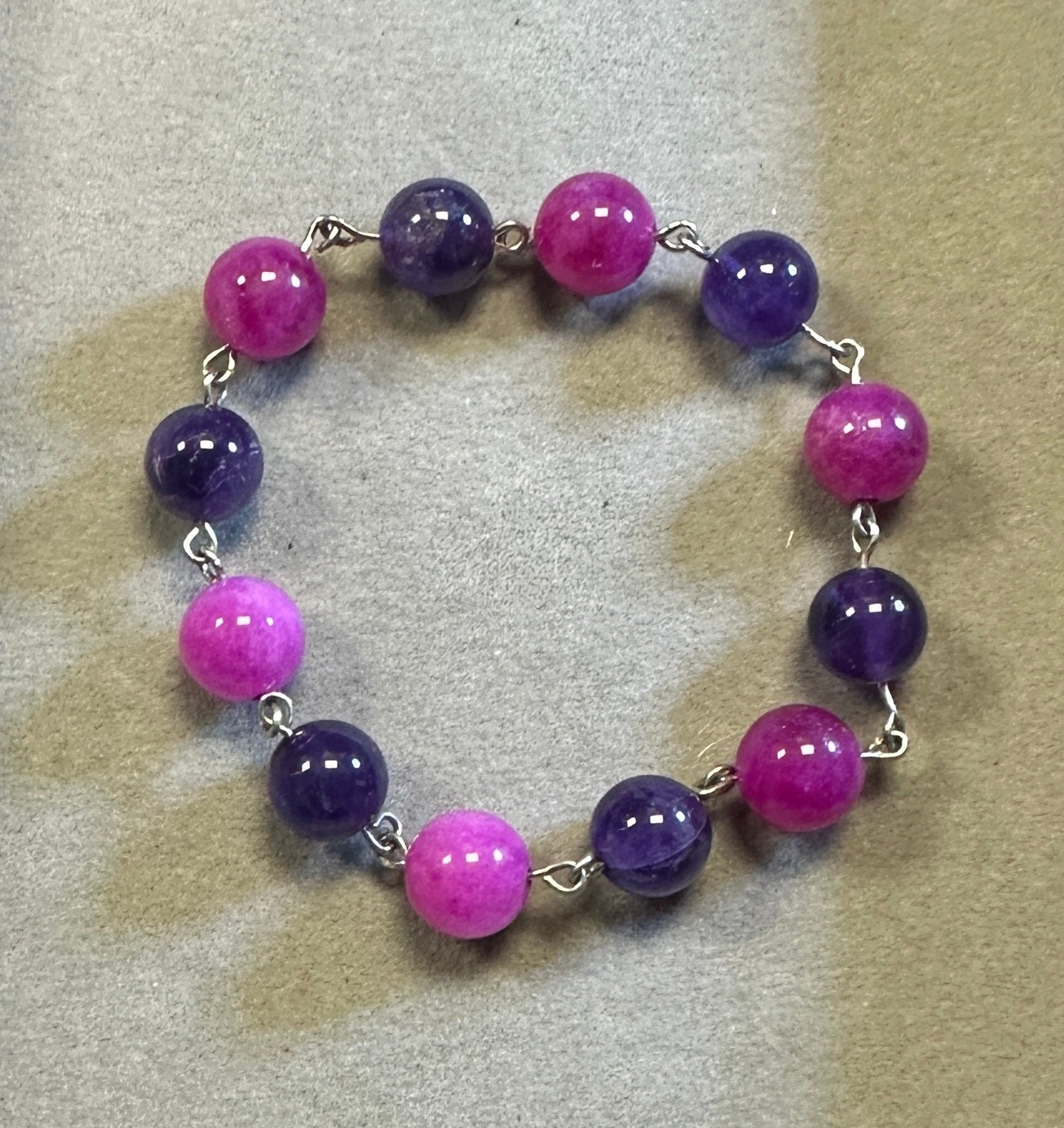 This handcrafted bracelet combines the soft, nurturing energy of pink tourmaline with the calming, spiritual strength of amethyst, both in 10mm natural gemstone beads. Each bead is carefully wire-wrapped in tinned copper, creating a durable yet elegant design that’s finished with a secure clasp for everyday wear.