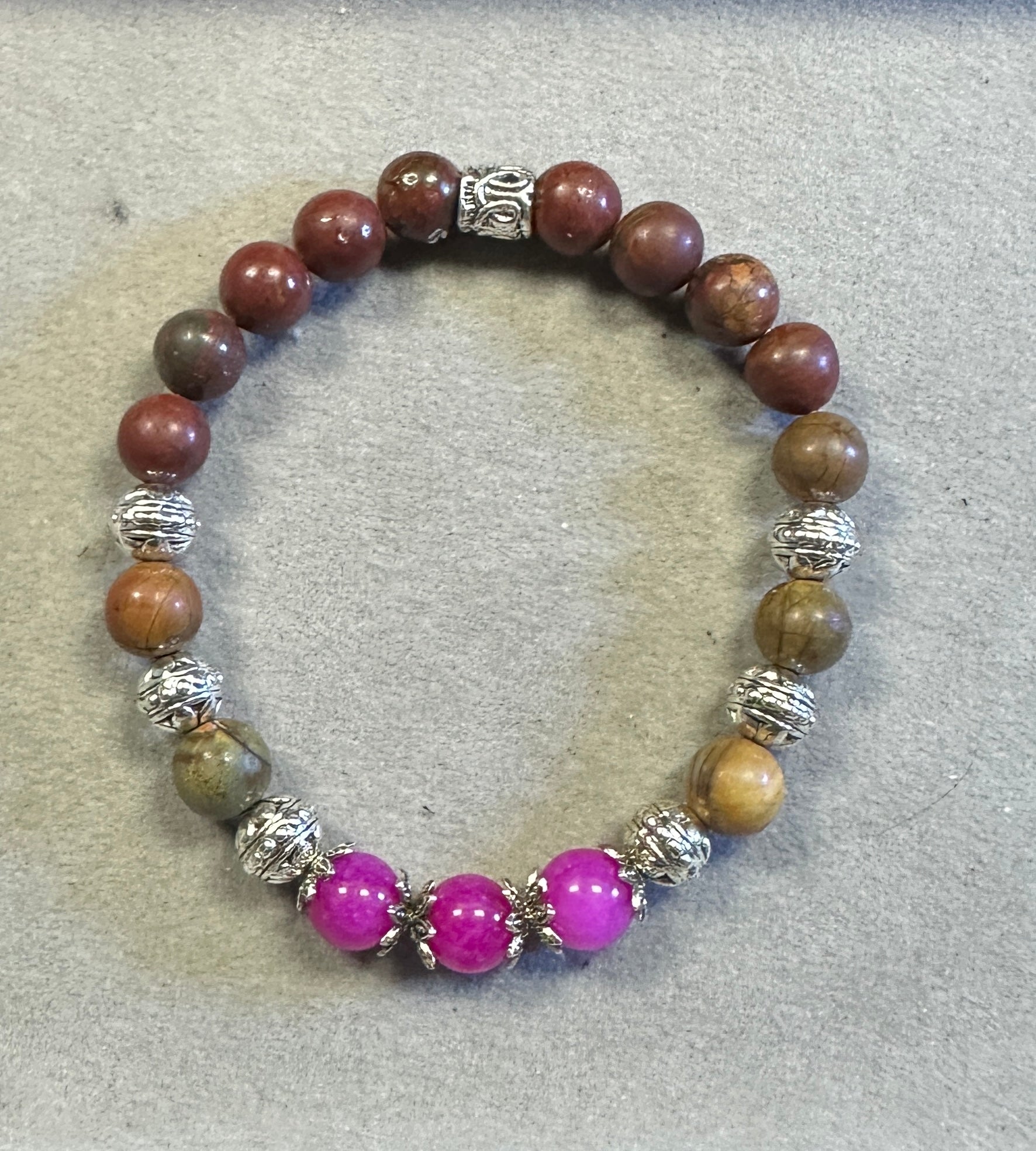 Pink Tourmaline and Earthy Sea Sediment with Tibetan Silver Bead – Handmade Gemstone Stretch Bracelet
