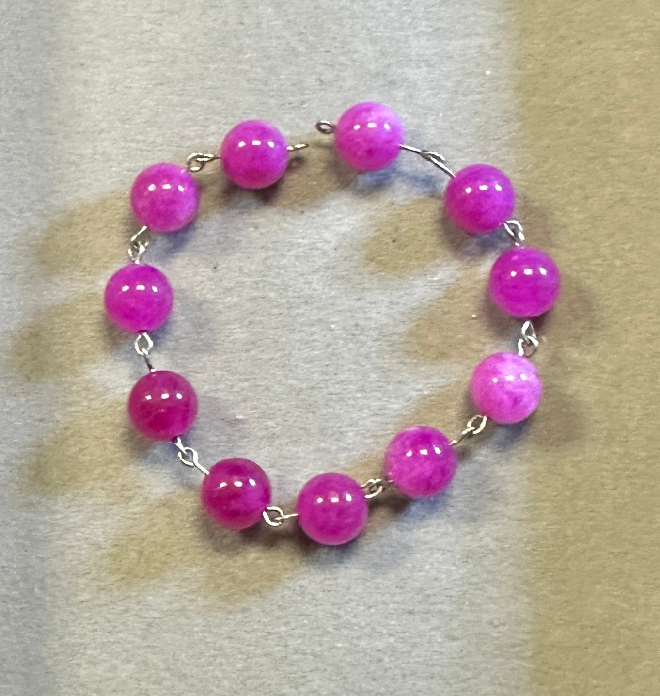 This handmade bracelet showcases 10mm natural pink tourmaline beads, wire-wrapped in tinned copper for strength and timeless appeal. Finished with a secure clasp, it’s designed for both everyday wear and special occasions.